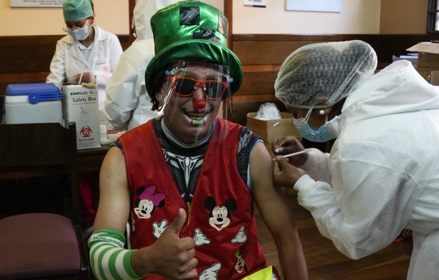 “Estamos agradecidos de vacunarnos, nos encanta alegrar a la gente y a los niños y pedimos que todos los jóvenes vengan a vacunarse. Así todo se normalizará y podremos volver a las fiestas”, dijo el payaso Chavalito Show mientras exhibía una jeringa enorme de plástico. “No duele, no pasa nada, pronto volverán las fiestas infantiles”, decía otro payaso mientras improvisaban un show callejero.