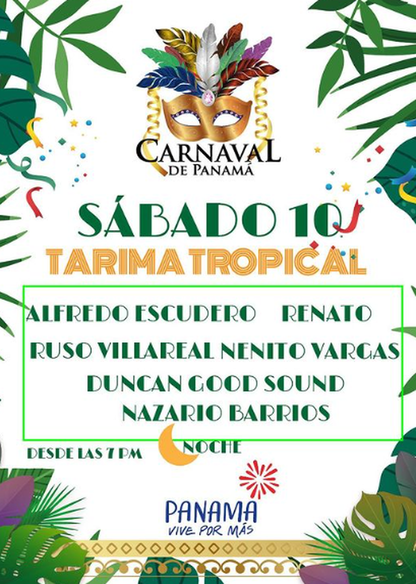 Los artistas que se presentarán en la Tarima Tropical, la noche del Sábado de Carnaval a partir de las 7:00 p.m. son: