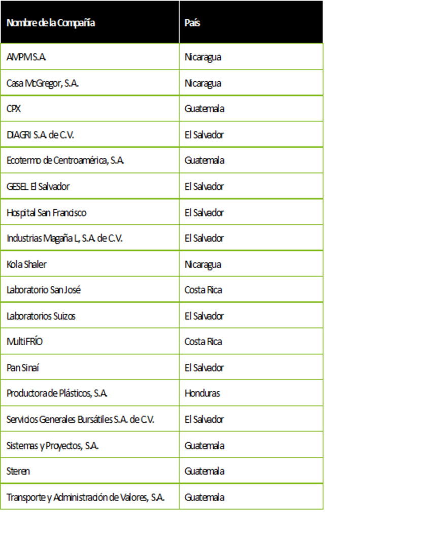 Este riguroso proceso dio como resultado la distinción de 18 empresas en 5 países de la región, las cuales generan en conjunto más de 5,000 empleos. Estas son las empresas reconocidas este año, por orden alfabético: