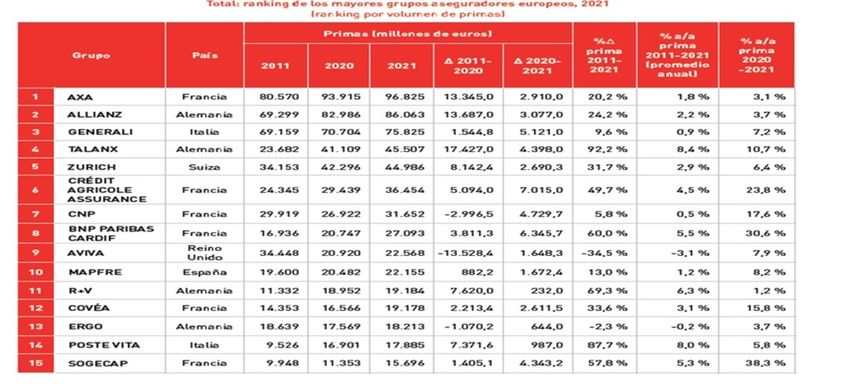 En Europa, la recuperación de la economía y de los mercados financieros en 2021 ha influido en el comportamiento positivo de los 15 mayores grupos aseguradores europeos, los cuales obtuvieron un aumento del 9,1% en sus ingresos por primas en 2021, hasta alcanzar los 579.284 millones de euros (en torno a 594.120 millones de dólares al cambio actual). Todos los grupos muestran crecimientos de primas, destacando los de los bancoaseguradores franceses Sogecap (38,3%), BNP Paribas Cardif (30,6%), Crédit Agricole Assurance (23,8%) y CNP Assurances (17,6%).