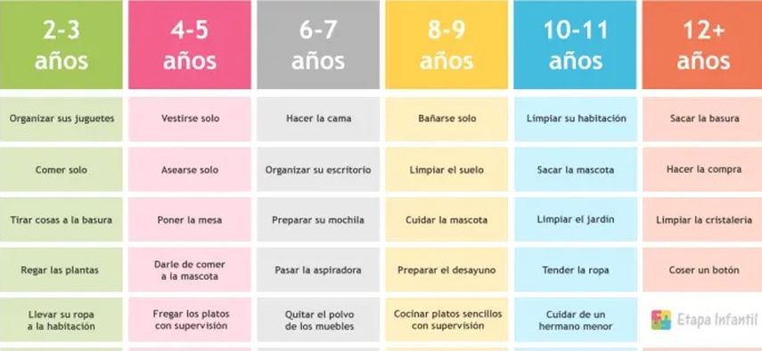 Esta semana les mostraré una tabla por edad, la cual muestra cada actividad o tarea; es también muy útil para analizar lo que le hemos incentivado a hacer en el hogar y lo que no, tomando en cuenta que también me refiero al hecho de vestirse solos y a asearse.