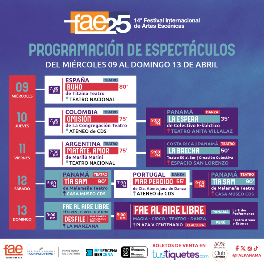 Hoy miércoles 9 de abril, a las 7:30pm se encienden las luces del escenario y se abren las puertas de uno de los encuentros culturales más esperados del año: el 14º Festival Internacional de Artes Escénicas - FAE Panamá 2025, que inicia con una potente propuesta desde España, BUHO, de Titzina Teatro de Barcelona, que marcará el tono de lo que será una semana llena de emoción, reflexión y arte escénico del más alto nivel.