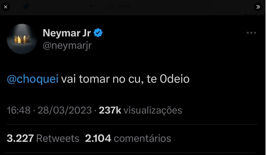 Uno de estos mensajes aún permanece en la red social de Ney, el mismo, es un Tweet contra el medio de comunicación brasileño Choquei escrito a las 16 horas.