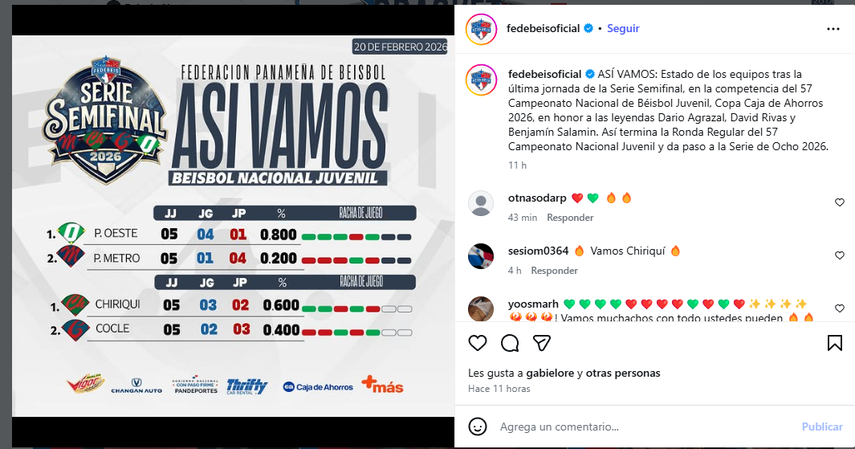 Las semifinales del Campeonato Nacional de Béisbol Juvenil de Panamá 2026 se reanudaron tras una pausa de ocho días por el carnaval, y la jornada del viernes 20 de febrero dejó movimientos importantes rumbo a la serie final.