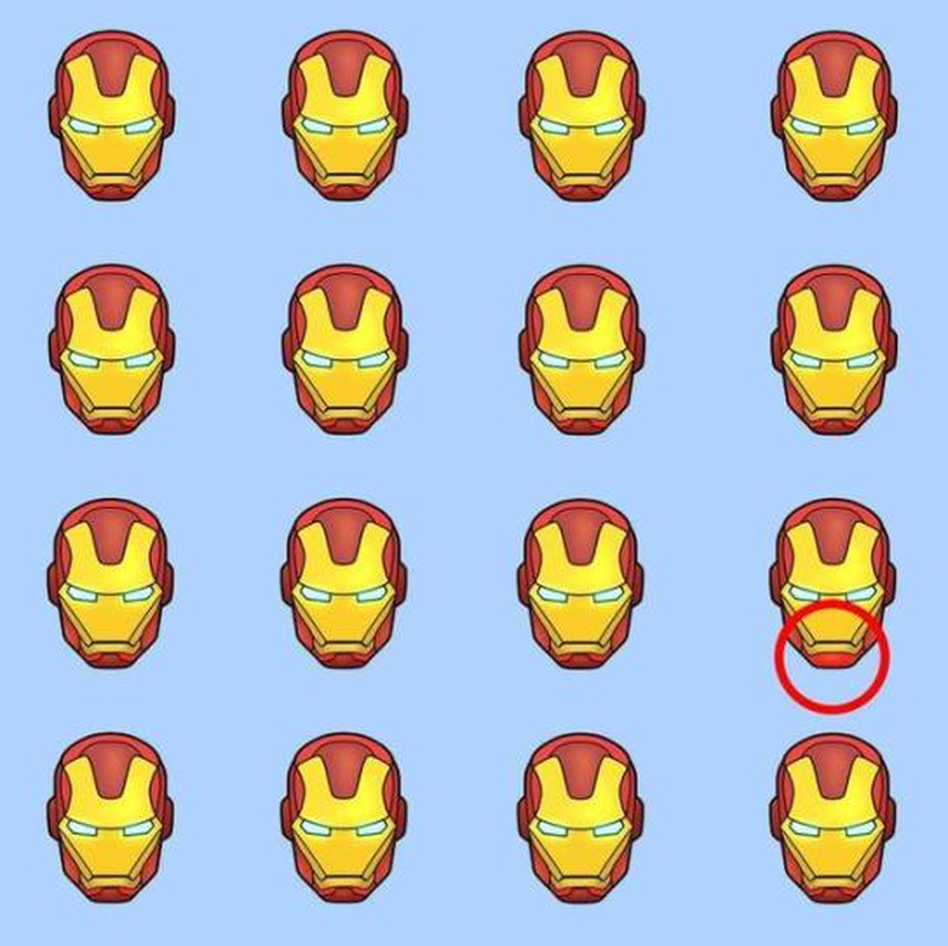 En la imagen, el casco de Iron Man a la derecha tiene un pequeño detalle que lo hace diferente. ¡Buena suerte!