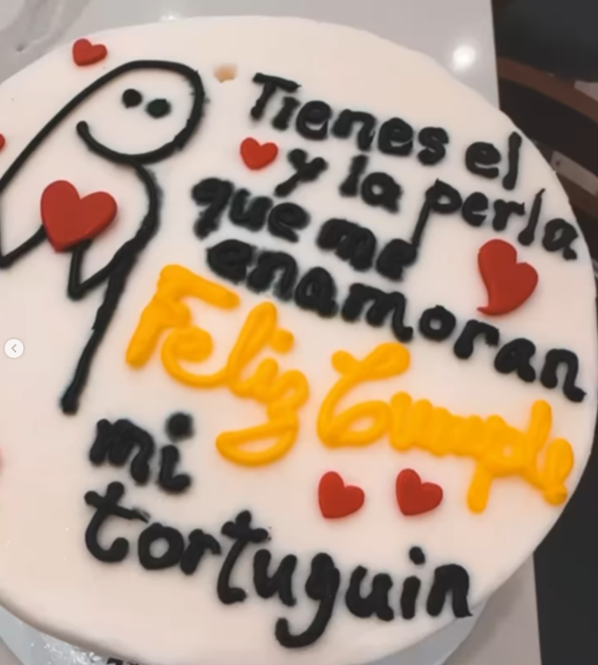 Anuel AA estuvo muy regalado pero el regalo de su novia Laury Saavedra fue increíble, pues le regaló un pastel con el muñequito deformado que está en tendencia con el siguiente mensaje: "Tienes el corazón y la perla que me enamoran, feliz cumple mi tortuguin". Por supuesto, que a pocas palabras, buen entendedor.