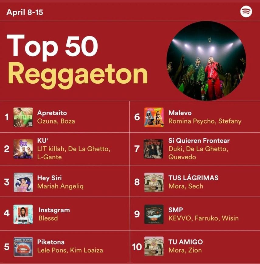 A escasos días del lanzamiento de la canción "Apretaito" de Ozuna y Boza; el tema se ha posicionado rápidamente en Spotify ubicándose como número uno en el top 50 de Reggaeton.