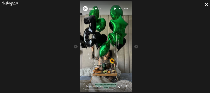 Emilia Cazzuchelli, mejor conocida como Cazzu compartió una historia de Instagram, donde mostraba el desayuno sorpresa que le había llevado a Nodal a la cama. En la imagen se podía observar al intérprete de Adiós Mi amor, con una mesita con un delicioso desayuno, un termo con su nombre y en la mano sostenía un girasol y con la otra sostenía los globos que decoraban la sorpresa.