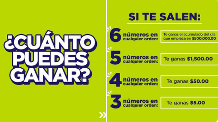 - Con 6 números en cualquier orden: te ganas el acumulado del día, que empieza en 500,000.00 dólares.
