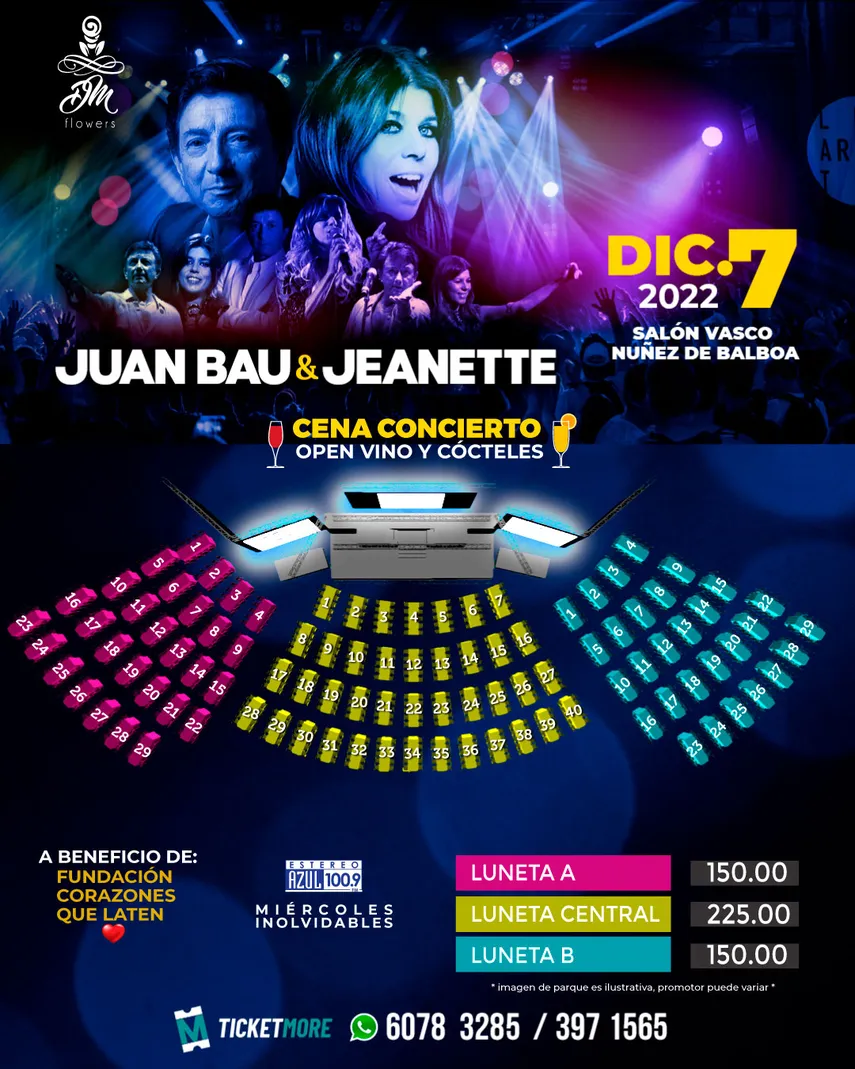 Este 7 de diciembre, en el salón Vasco Núñez de Balboa, las baladas románticas y el amor también celebran a las mamás en la Cena Concierto de Juan Bau y Jeanette, con open vino incluido.