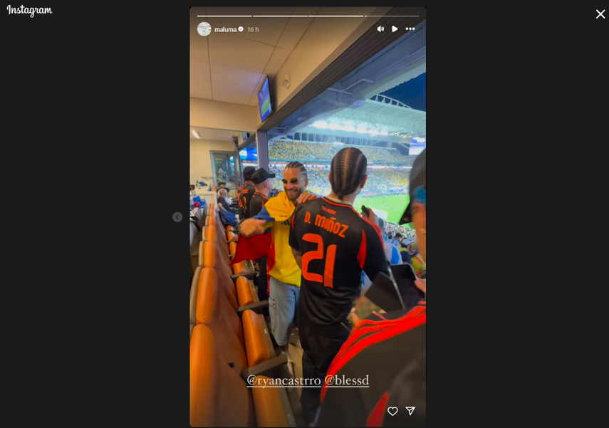 Los cantantes Maluma y Ryan Castro lucieron las camisetas de Colombia y compartieron en la gran final de la Copa América 2024.