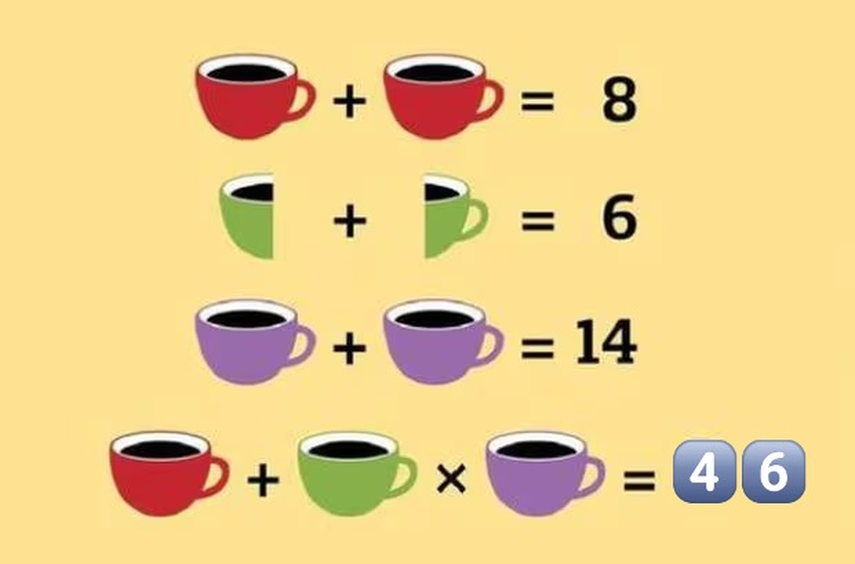 Ahora sí, con estos datos solo debes animarte a hacer el cálculo final y lograrás resolver el acertijo. La respuesta: 4 + 6 x 7 = 4 + 42 = 46. A nivel matemático, existe cierta dificultad para lograr una resolución final porque se presenta una taza a la mitad y es un detalle que no tenías en cuenta. Ya en la parte final, tampoco puede olvidar que la multiplicación se realiza primero para luego terminar con la suma.