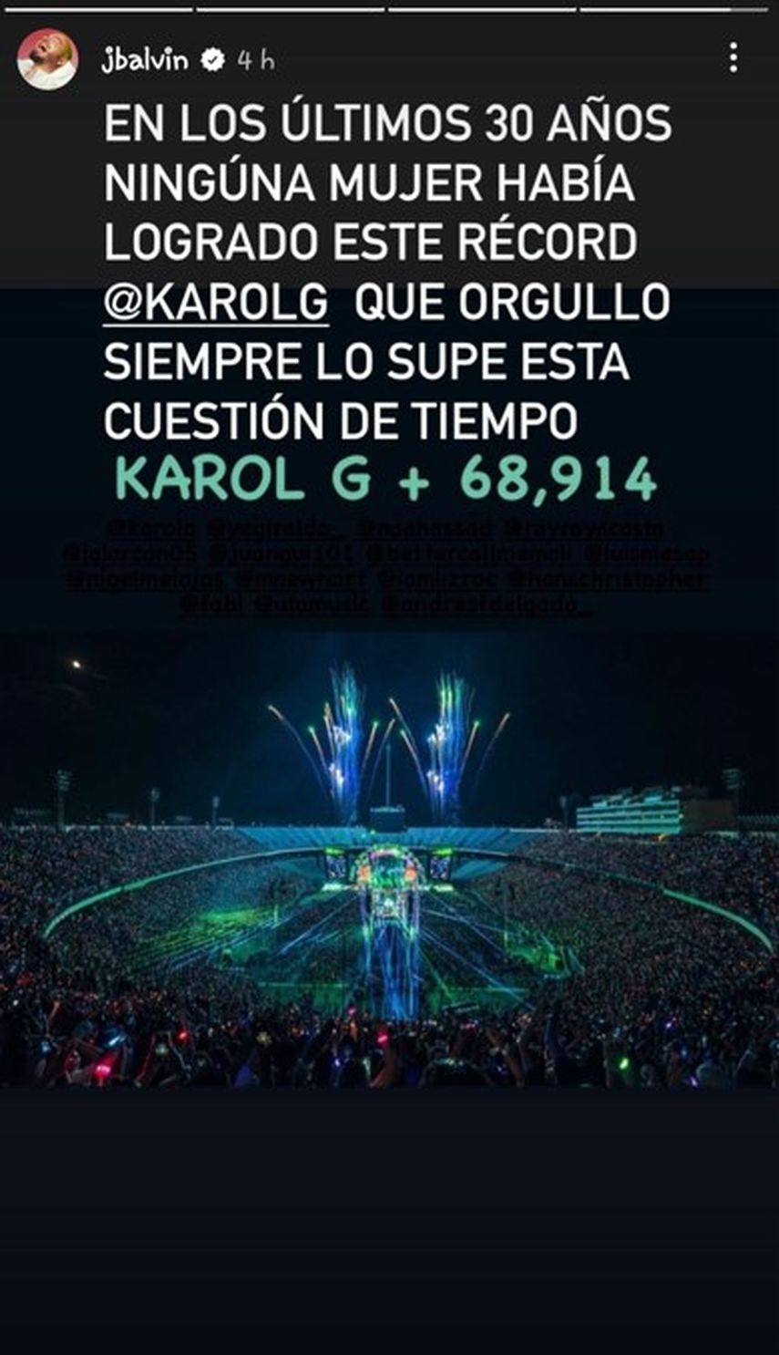 El interprete de "Azul" dijo lo siguiente en una historia de Instagram: "En los últimos años 30 años ninguna mujer había logrado este récord @KarolG que orgullo siempre lo supe está cuestión de tiempo. Karol G + 68, 914"