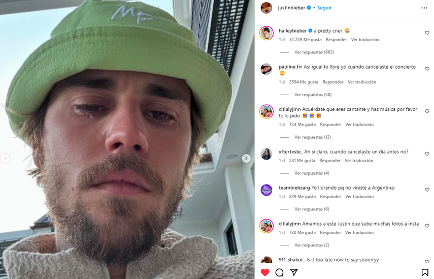 Pero lo que de verdad estalló una ola de críticas por parte de los seguidores fue el comentario de la esposa de Bieber, quien puso "Un bonito llorador" haciendo alusión a la foto de su marido con lágrimas en los ojos.