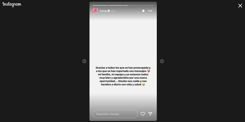 "Gracias a todos los que se han preocupado y a los que se han reportado con mensajes, mi familia, mi equipo y yo todos muy bien y agradecida con una nueva oportunidad... Diosito nos cuide y nos bendice a diario con vida y salud", dijo Karol G mediante una Historia en su cuenta de Instagram.