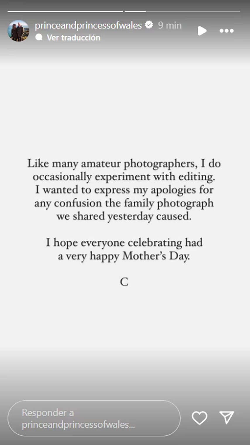 “Como muchos fotógrafos aficionados, de vez en cuando experimento con la edición. Quería expresar mis disculpas por cualquier confusión que haya causado la fotografía familiar que compartimos ayer. Espero que todos los que celebran hayan tenido un muy feliz Día de la Madre”, ha escrito en una storie, que firma con la inicial de su nombre, una ‘C’.