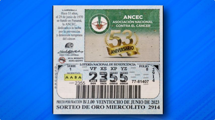 La Lotería Nacional de Beneficencia de Panamá realizará el sorteo miercolito N°2914 correspondiente al 28 de junio de 2023. En esta oportunidad se destaca en su impresión a "ANCEC en su 53° aniversario".