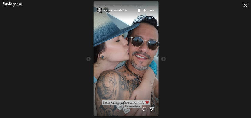 Su esposa, la modelo Nadia Ferreira ha compartido en sus redes sociales como festejan en familia el cumpleaños del salsero Marc Anthony. "Feliz Cumpleaños amor mío", escribió Ferreira en una de las Historia en donde le daba un beso a su esposo.