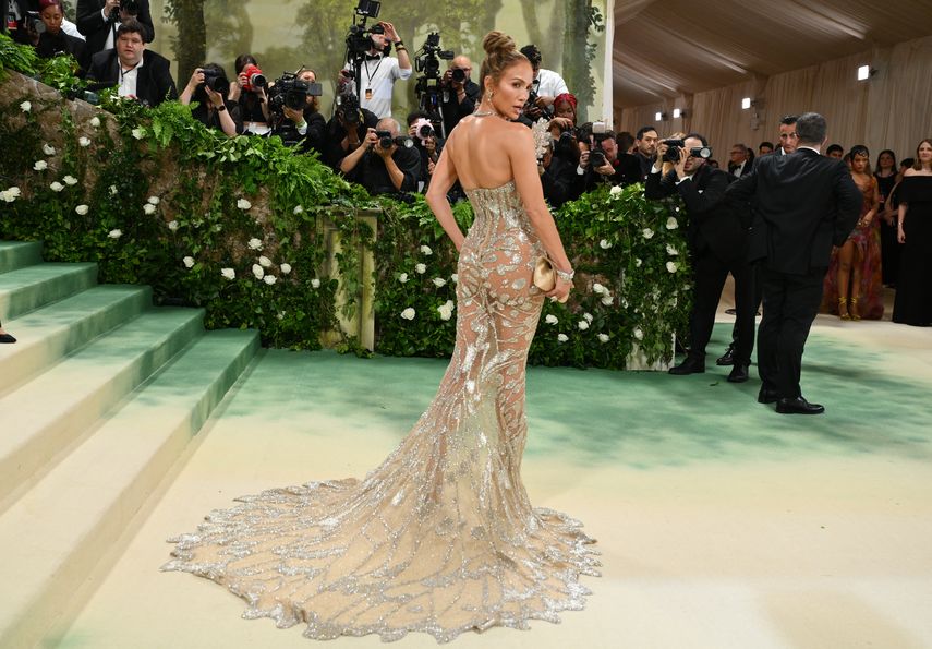 La cantante Jennifer López lució un espectacular diseño de piedrería firmado por "Schiaparelli", con bastante transparencia y escote, dejando al descubierto su espalda.