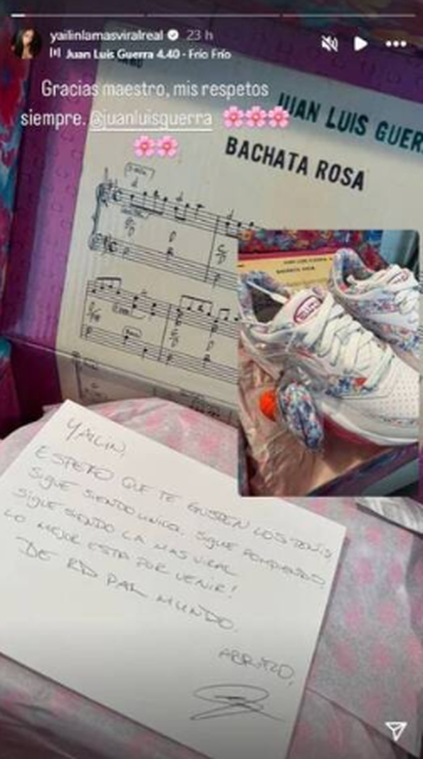 La cantante dominicana Yailin La Más Viral ha causado revuelo en redes sociales tras presumir haber recibido un regalo especial del reconocido cantante Juan Luis Guerra. Según Yailin, se trataba de unos tenis de edición limitada inspirados en el emblemático disco Bachata Rosa, acompañados de un mensaje motivador firmado por el intérprete de La Bilirrubina.