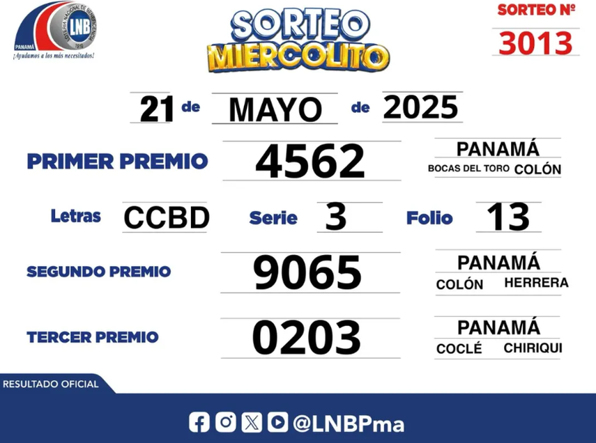 Llegó el momento de conocer los resultados del sorteo miercolito de la Lotería Nacional de Panamá que jugará hoy de 21 de mayo de 2025.