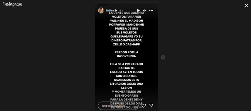 "La gente que compró boletos para ver a Yailin en el Madison, por favor mándenme prueba de sus boletos que le pagaré yo su dinero para atrás por Zelle o CashApp", dijo el rapero pidiendo perdón por la inconveniencia.