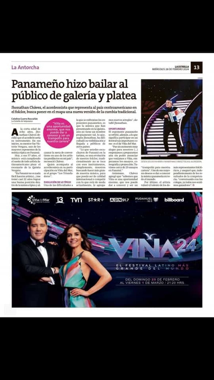 Este miércoles los periódicos locales de Chile dedicaron sus primeras páginas para hablar del panameño Jhonathan Chávez y su excelente presentación en Viña del Mar 2024.