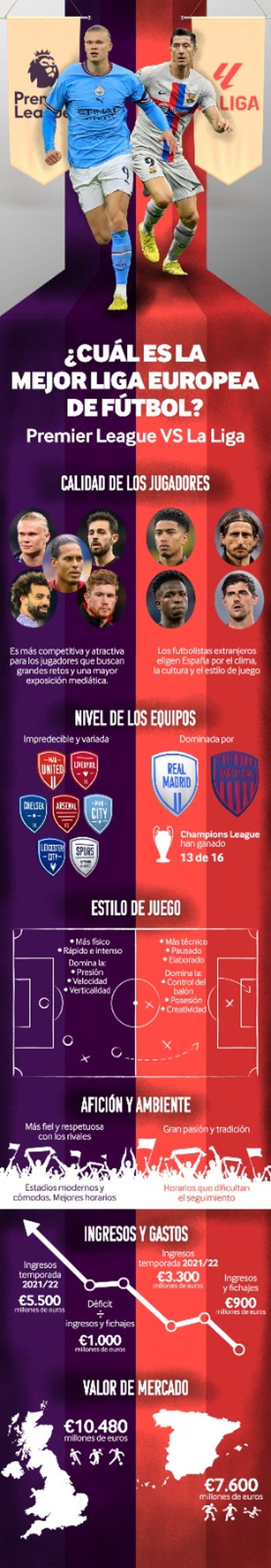 LaLiga y la Premier League son las dos ligas más importantes de Europa, y cada una tiene lo suyo: Cracks, equipos legendarios, hinchas apasionados y mucha rivalidad. Pero, ¿Cuál se lleva la corona? ¿Cómo las podemos medir?