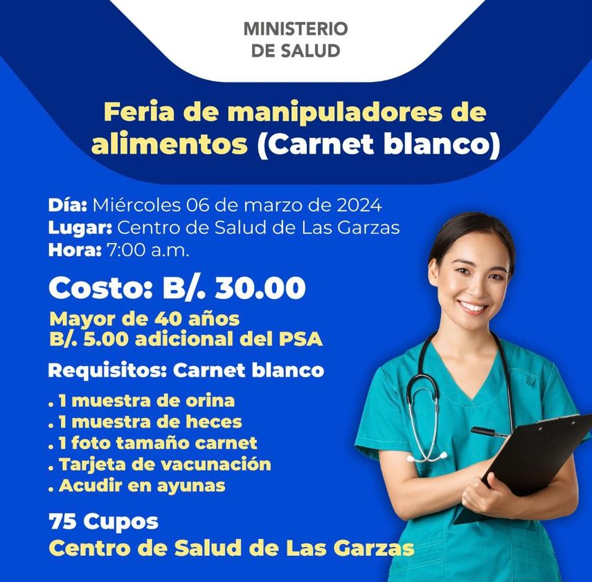 En el centro de Salud de las Garzas, el Ministerio de Salud llevará a cabo una feria de manipuladores de alimentos para obtener carnet blanco desde las 7:00 a.m.