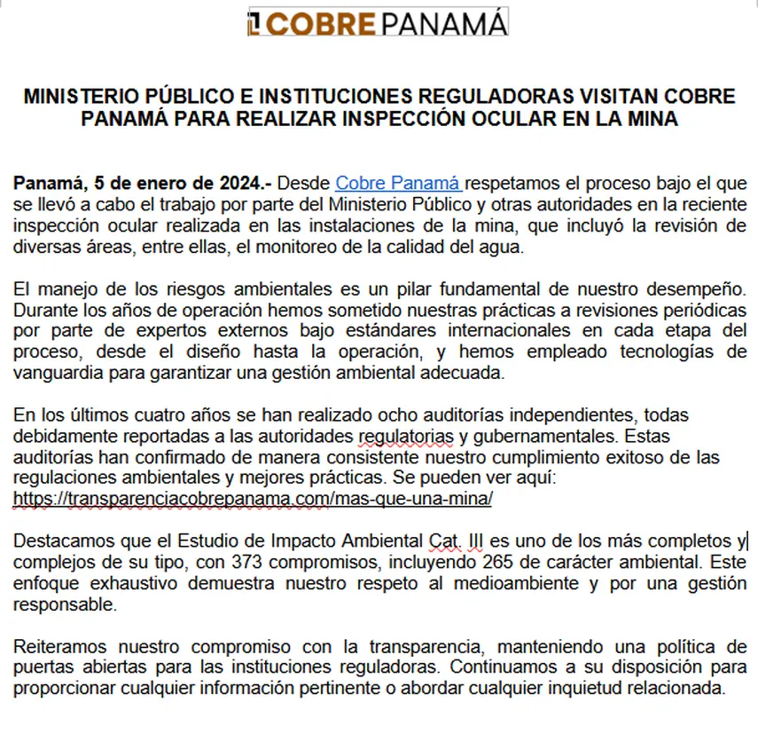 Minera Panamá emitió un comunicado en respuesta a la inspección realizada por el Ministerio Público y otras autoridades en la mina Cobre Panamá. En la nota, la empresa afirmó que respeta el ejercicio realizado, que incluyó la revisión de diversas áreas, incluido el monitoreo de la calidad del agua.