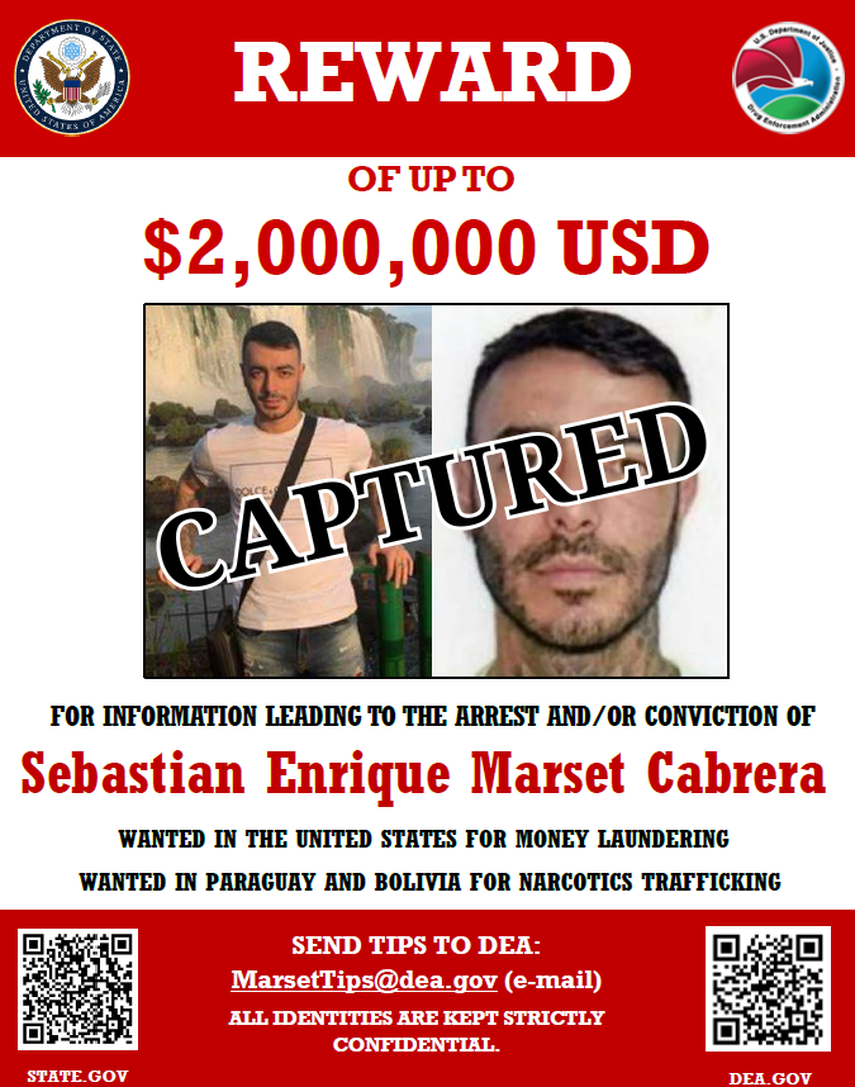 La publicación va acompañada por una imagen del Departamento de Estado en la que se ofrece una recompensa de 2 millones de dólares "por información que conduzca al arresto" de Marset, con la palabra superpuesta "capturado".