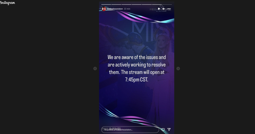 Además expresó que están trabajando para cumplir con la transmisión de la Preliminar de Miss Universo 2023. "Estamos conscientes de los problemas y estamos activamente trabajando para resolverlos. La transmisión iniciará 7:45 p.m. (CST)", agregaron.
