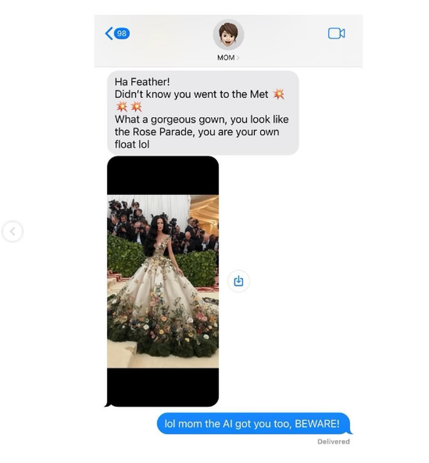 “¡Ja Feather! No sabía que fuiste al Met. Qué vestido tan hermoso. Te pareces al Desfile de las Rosas, eres tu propia carroza jajaja”, dijo la madre de Katy Perry en el mensaje que le envió, ante esto ella respondió de esta manera: “Jaja, mamá, la IA también te atrapó, ¡CUIDADO!”.