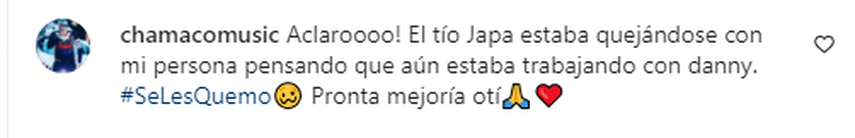 El artista Urbano Chamaco se pronunció con un comentario en la publicación de Instagram que realizó DaFlow Internacional, diciendo lo siguiente: “Aclaro! El tío Japa estaba quejándose con mi persona pensando que aún estaba trabajando con Danny Yash, #SeLesQuemo ... Pronta mejoría oti".