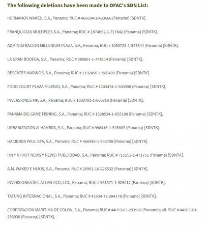 Sin embargo, según explica la Embajada de Estados Unidos en Panamá, el retiro de las empresas disueltas de esta lista, no cambia la situación de quienes habían sido sancionados, "esas personas y entidades continúan designados por la OFAC".