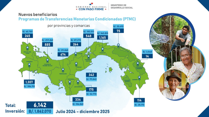 El Ministerio de Desarrollo Social (MIDES) anunció la incorporación de 6,142 nuevos beneficiarios a los Programas de Transferencias Monetarias Condicionadas (PTMC), reafirmando su compromiso con la equidad social y la transparencia en la distribución de los recursos públicos. La inclusión de estas personas representa una inversión de B/. 1,862,070, destinada a hogares en pobreza y pobreza extrema que permanecieron por años fuera del sistema de protección social.