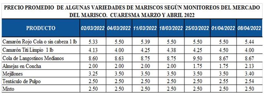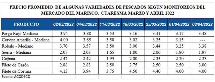 A continuación cuadros de la Acodeco con los precios promedios de algunos pescados y mariscos: