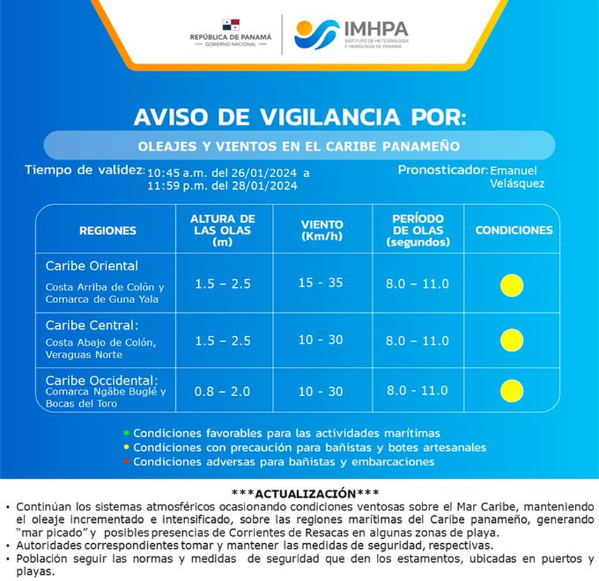 El Instituto de Meteorología e Hidrología de Panamá (IMHPA) ha emitido un aviso de vigilancia por oleajes y vientos en el Caribe panameño. Este aviso es válido hasta el 28 de enero de 2024.