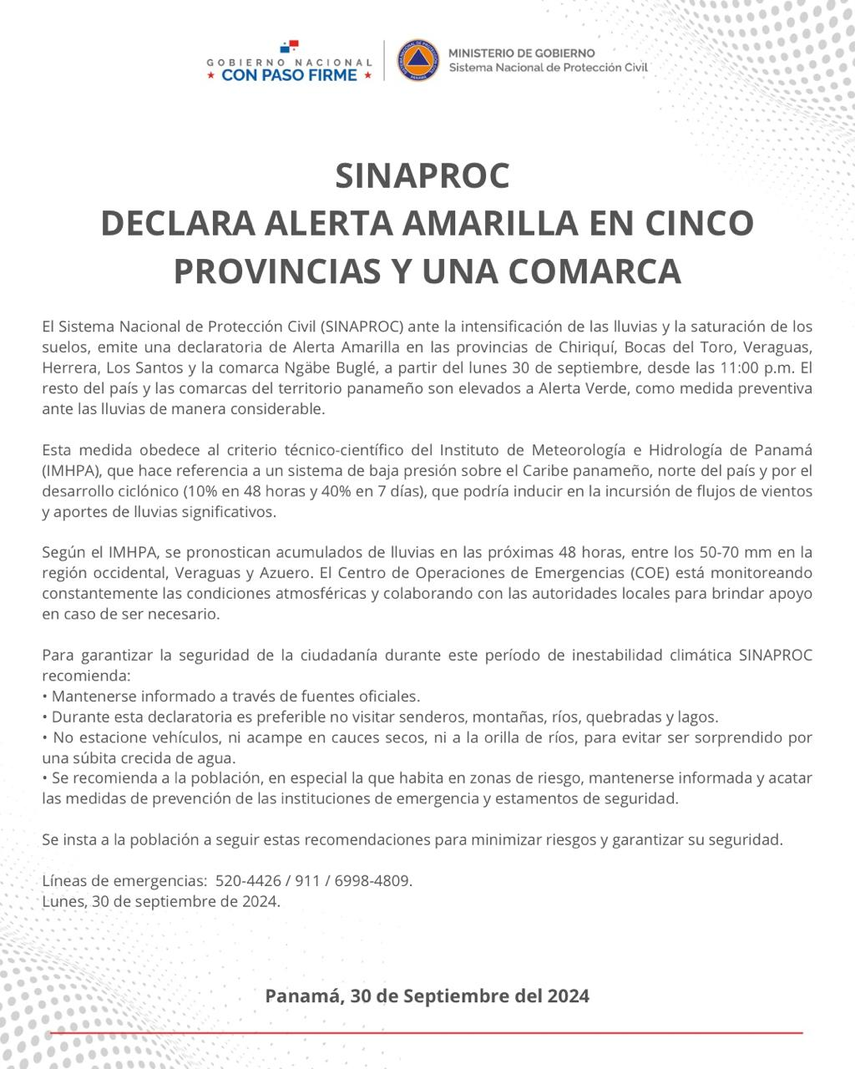 El Sistema Nacional de Protección Civil (SINAPROC) ha emitido una declaratoria de Alerta Amarilla para las provincias de Chiriquí, Bocas del Toro, Veraguas, Herrera, Los Santos y la comarca Ngäbe-Buglé, debido a la intensificación de las lluvias y la saturación de los suelos. El resto del país y sus comarcas han sido elevados a Alerta Verde como medida preventiva.