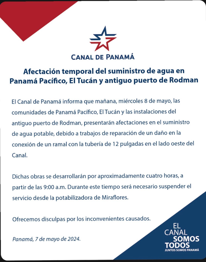 El Canal de Panamá informa que mañana miércoles 8 de mayo, las comunidades de Panamá Pacífico, El Tucán y las instalaciones del antiguo puerto de Rodman, presentarán afectaciones en el suministro de agua potable, debido a trabajos de reparación de un daño en la conexión de un ramal con la tubería de 12 pulgadas en el lado oeste del Canal.