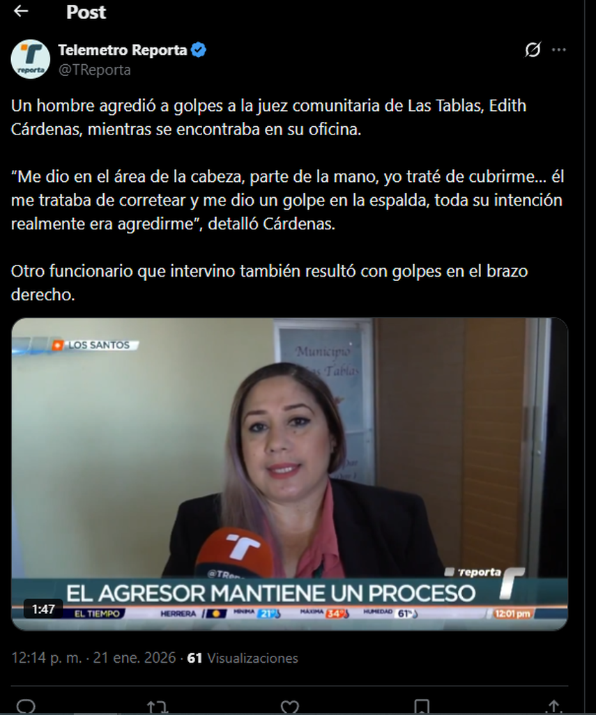 Un hecho de violencia se registró en la provincia de Los Santos, donde un hombre agredió físicamente a la jueza comunitaria de Las Tablas, Edith Cárdenas, mientras esta se encontraba en su oficina cumpliendo funciones.