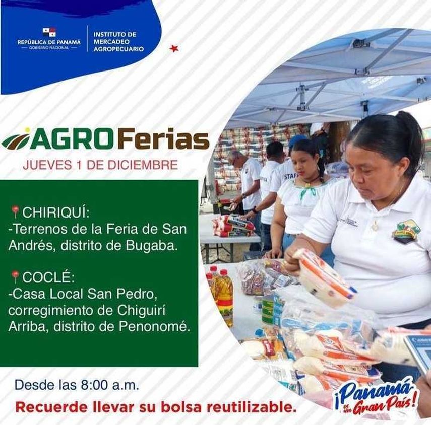El Instituto de Mercadeo Agropecuario (IMA), realizará Agroferias en Chiriquí, Coclé y la comarca Ngöbe Buglé hoy 1 de diciembre, en donde los ciudadanos podrán apersonarse a los distintos puestos de venta para adquirir productos alimenticios a bajo costo y de buena calidad.