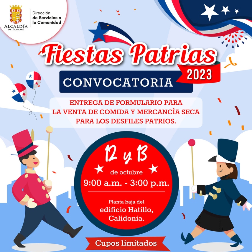 La Dirección de Servicios a la Comunidad de la Alcaldía de Panamá informa a los interesados que otorgará 300 permisos para la venta de comidas, bebidas y buhonerías en las rutas de los Desfiles Patrios del 3 y 4 de Noviembre.