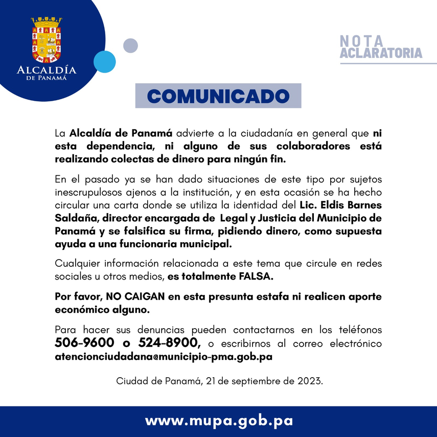 El Municipio capitalino detalla que, en el pasado ya se han dado situaciones de este tipo por sujetos inescrupulosos ajenas a la institución, y "en esta ocasión se ha hecho circular una carta donde se utiliza la identidad del Lic. Eldis Barnes Saldaña, directora encargada de Legal y Justicia del Municipio de Panamá y se falsifica su firma, pidiendo dinero, como supuesta ayuda a una funcionaria municipal".