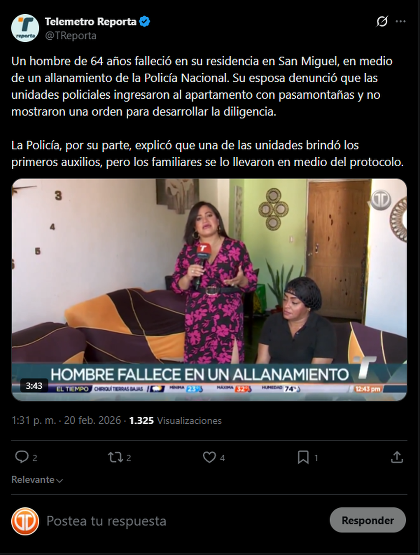 Un hombre de 64 años falleció durante un operativo de allanamiento realizado el pasado 19 de febrero en el sector de San Miguel, sector de San Miguel un hecho que ha generado cuestionamientos por parte de sus familiares y una respuesta oficial de la Policía Nacional de Panamá.