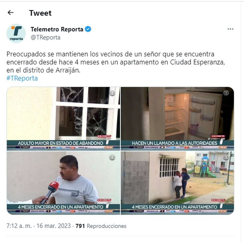 Residentes de Ciudad Esperanza, en el distrito de Arraiján, provincia de Panamá Oeste denuncian el abandono de un adulto mayor en uno de los apartamentos desde hace más de 4 meses; el anciano asegura que es un infierno para él estar encerrado por lo que desea su libertad.