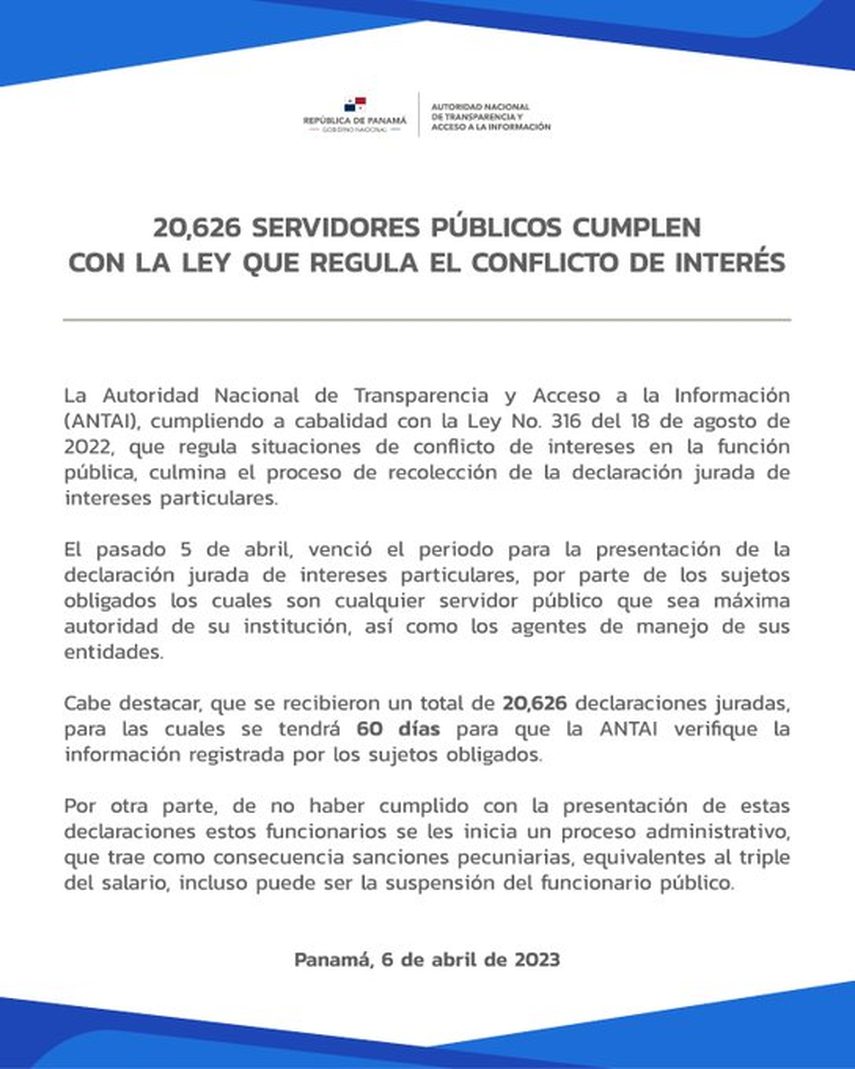 20.626 servidores públicos hicieron sus Declaraciones Juradas de Intereses Particulares, según la Autoridad Nacional de Transparencia y Acceso a la Información (Antai).