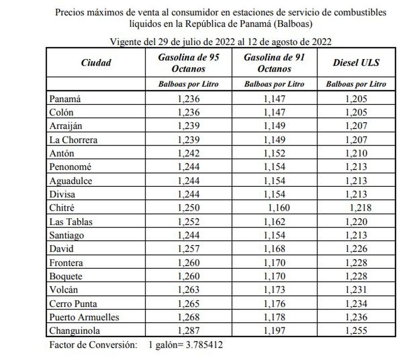 Al hacer la conversión (1 galón = 3.785412 litros), el precio por galón de estos combustibles para las provincias de Panamá y Colón es de: