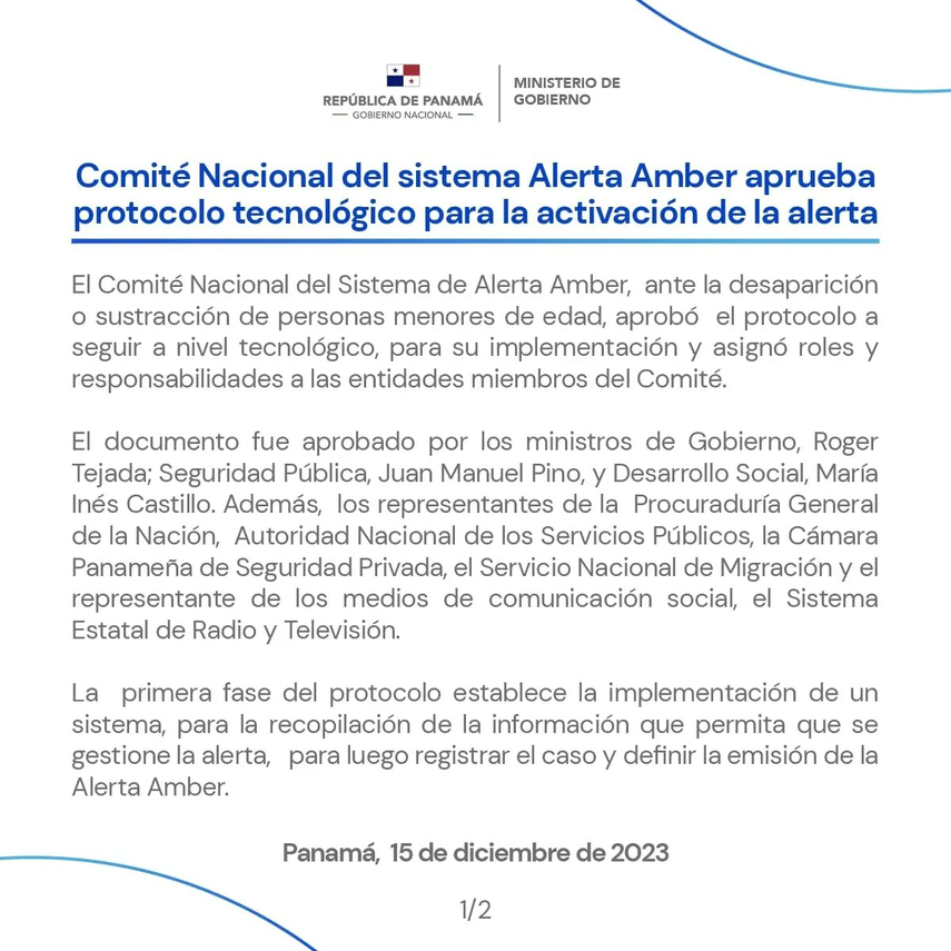 El Ministerio de Gobierno (MINGOB) anunció el viernes 15 de diciembre de 2023, que el Comité Nacional del Sistema de Alerta AMBER aprobó el protocolo tecnológico a seguir en casos de desaparición o sustracción de personas menores de edad. Este protocolo se implementará para agilizar y optimizar la respuesta a este tipo de situaciones.