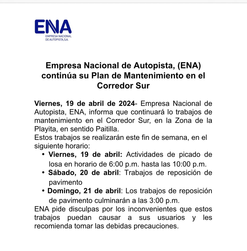 La Empresa Nacional de Autopista, informa que continuo de los trabajos de mantenimiento en el Corredor Sur, será en la Zona de la Playita, en sentido Paitilla. ENA pide disculpas por los inconvenientes que estos trabajos puedan causar a sus usuarios y les recomienda tomar las debidas precauciones.